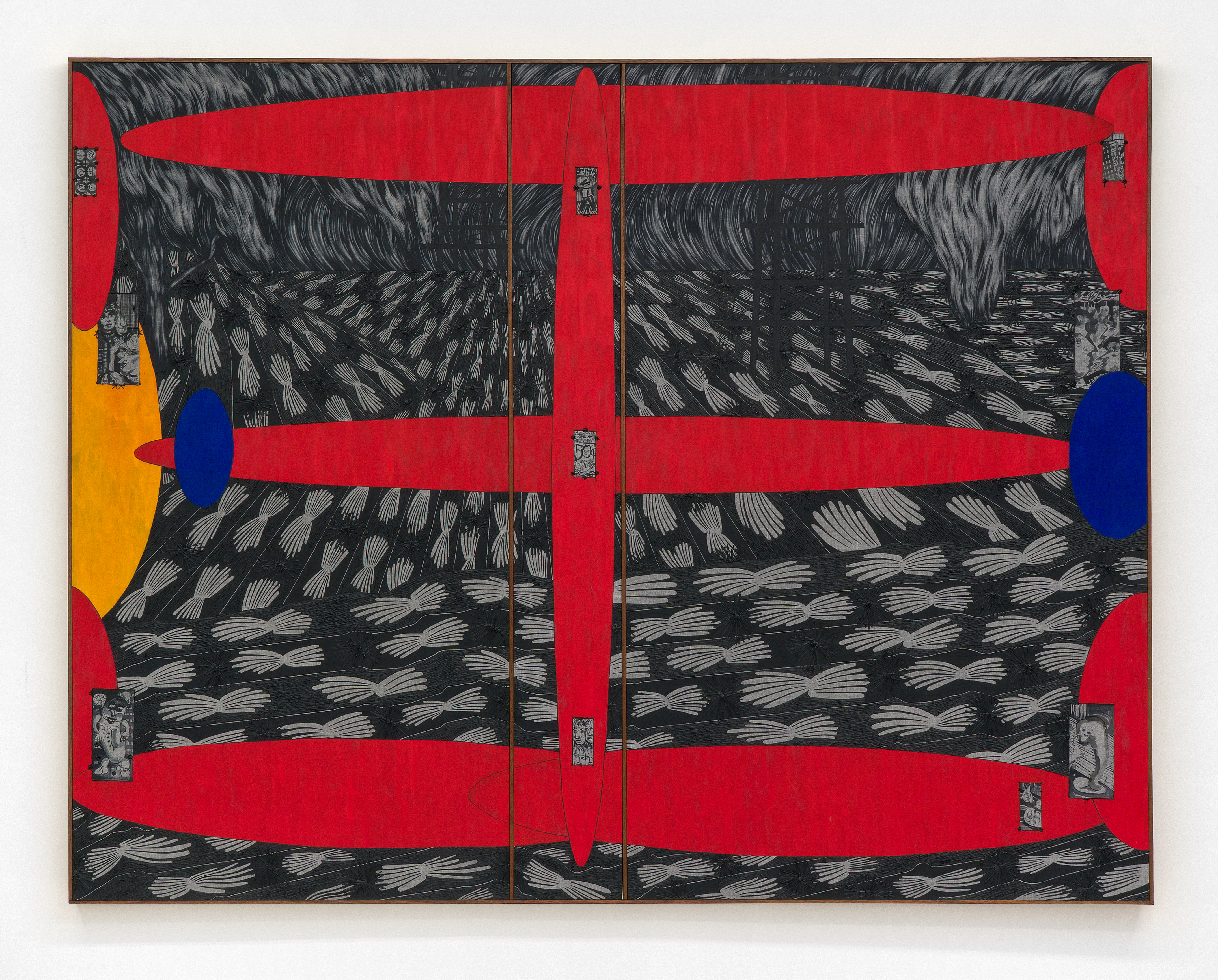 Oil, acrylic, upholstery, walnut artist frame